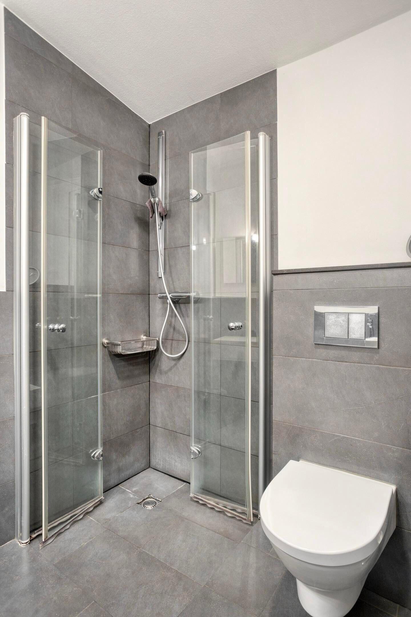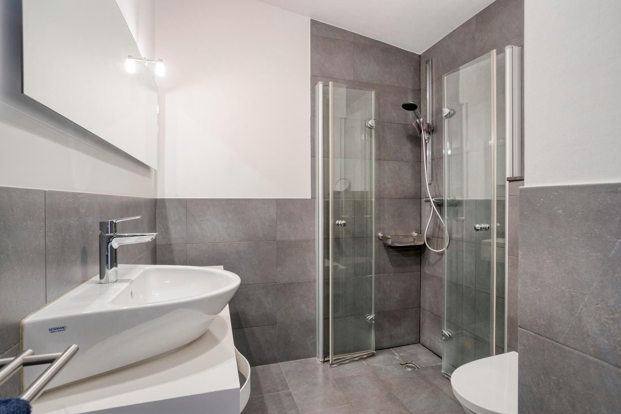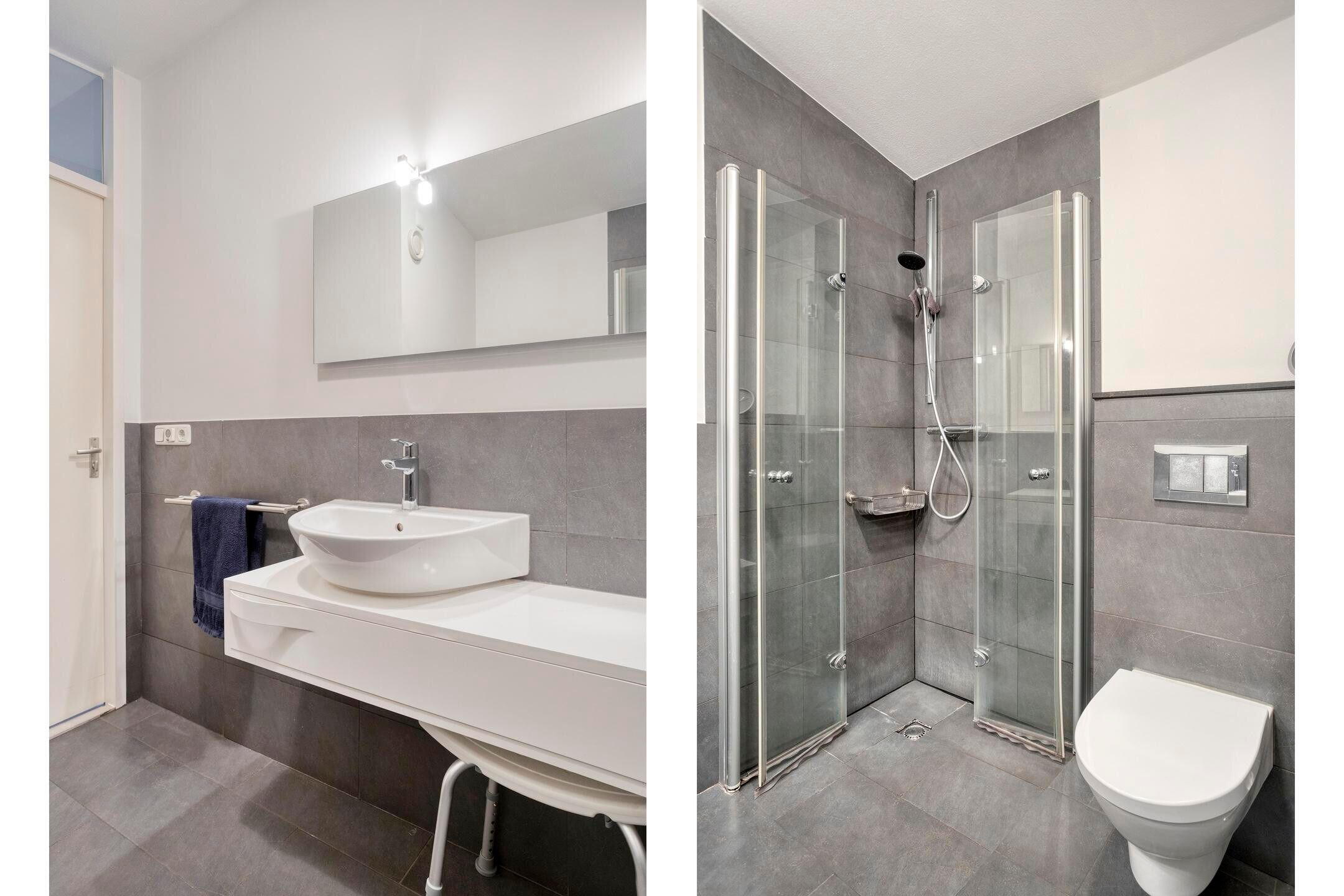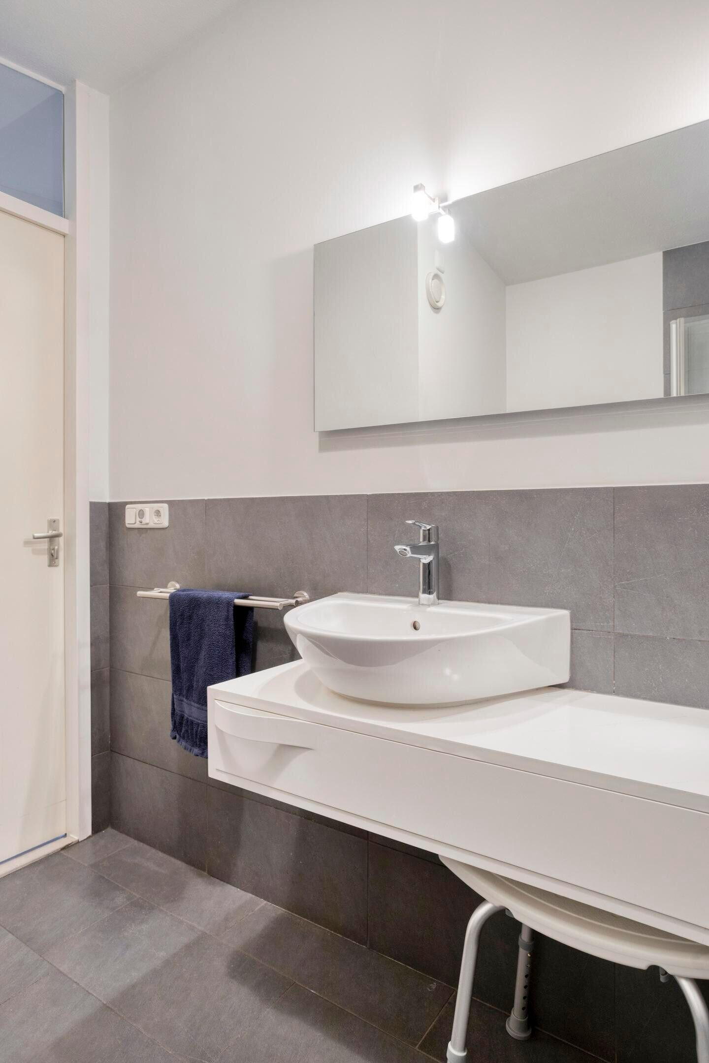 De nette badkamer van ca. 5m2 beschikt over een moderne inloopdouche, hangend toilet, wastafel met luxe mengkraan en een wastafel meubel.